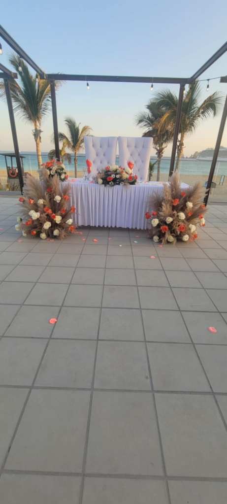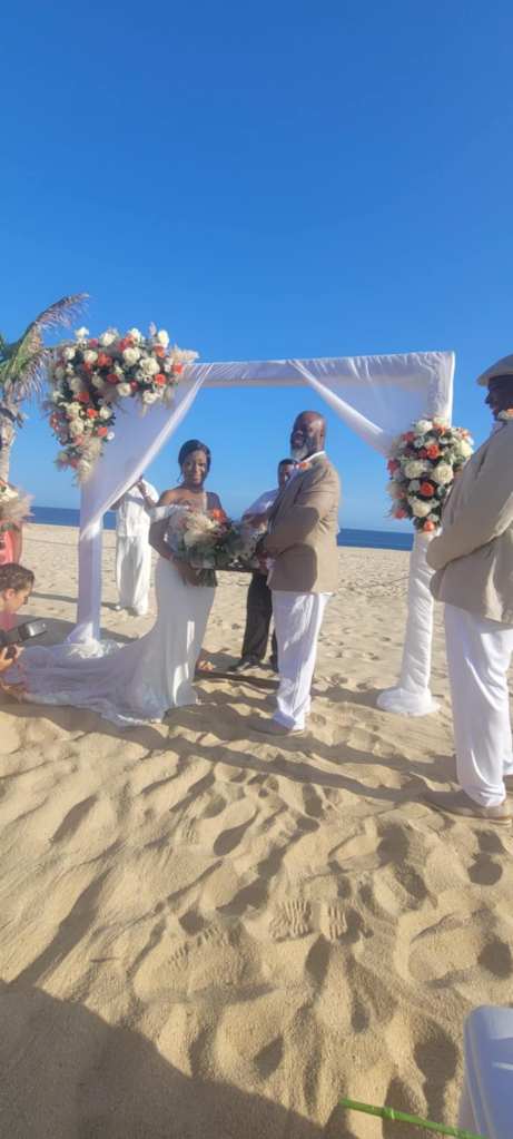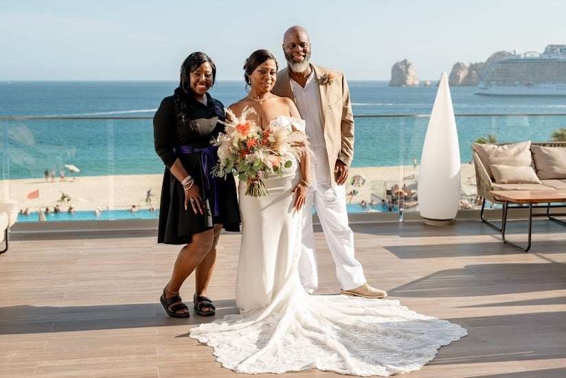 Dawn and Mark’s destination wedding was an unforgettable celebration, set against the stunning backdrop of the Riu Baja California Resort in Los Cabos, Mexico. Surrounded by 50 of their closest friends and family, the couple exchanged vows on a beautiful October day, with the ocean breeze and stunning sunset adding to the magic of the moment.